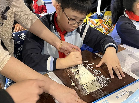 在小郁老师的讲解下,同学们对于蓝印花布的制作有了初步的了解并且开始动手尝试制作属于自己的蓝印花布。稚嫩的手掌握住刮板,在爸爸妈妈们的帮助下同学们顺利完成了刮浆、揭版、吹干等步骤。