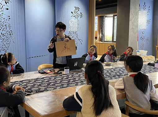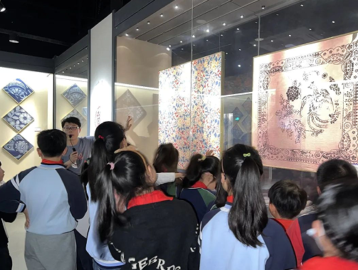 进馆之后,同学们在小郁老师的带领下穿过古色古香的回廊,走进位于美术馆二楼的蓝印花布艺术馆。随后,小郁老师给同学们介绍了蓝印花布的历史由来和制作的基本流程:刻版——刮浆——揭版——浆布——染色——显色——刮白——完成。