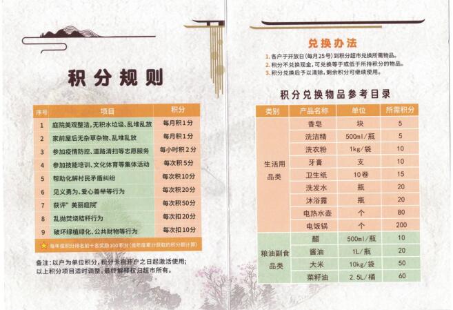 殷庄村积分制管理集物质奖励与精神奖励为一体,鼓励村民全方位全过程参与到乡村治理、人居环境整治等工作。村民通过自觉规范垃圾分类、推进文明乡风、涌跃参加志愿活动进行志愿积分和参与“十星文明户”评选,通过累计的个人积分即可前往超市兑换相应商品。