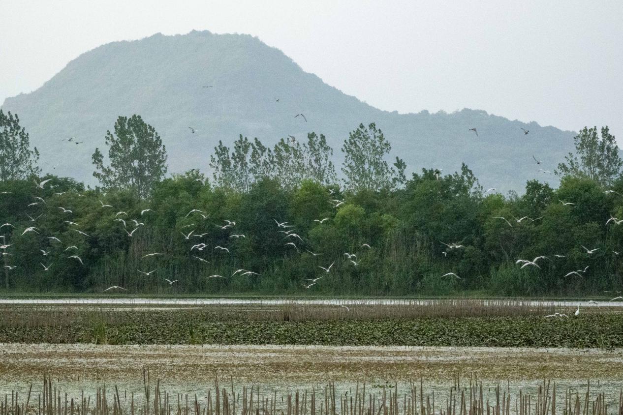 据悉,这群须浮鸥于7月初抵达赤山湖。它们的繁殖点位于湿地公园西南侧的白水荡湿地保育区。该区域是为野生动物保育营造的一片封闭管理区域,承担着湿地生态系统、水资源、湿地动植物资源的恢复保护及相关科研工作。近年来,赤山湖通过实施生态修复、保护巡查、科研监测、水环境整治等举措,显著改善了湿地公园及周边的生态环境。良好的湿地生境和丰富的鱼类资源吸引了众多野生鸟类前来栖息、繁衍,包括中华秋沙鸭、青头潜鸭、东方白鹳等“国宝级”鸟类。赤山湖记录到的野生鸟类种数,以每年10%左右的速度递增,目前已超过180种,其中国家一级重点保护野生动物3种,国家二级重点保护野生动物30余种。王维