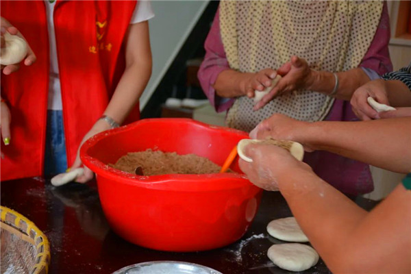 在中秋节到来之际,志愿者们来到佴池村刘恩伯家,一起做起了“糖鼓馍”,在欢声笑语中喜迎中秋,感受中秋的团结气氛。大家一起围在桌前,包馅、锤面饼、撒芝麻、包入芝麻馅……不一会儿,圆圆的“糖鼓馍”便呈现出来。