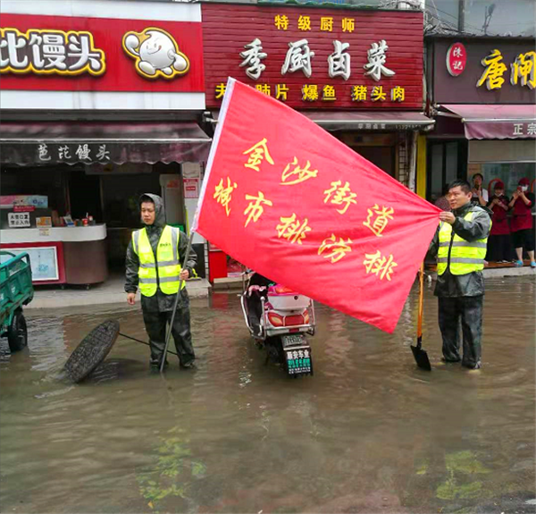 党员率先垂范,党旗高高飘扬,筑牢防汛抗台的坚强战斗堡垒。金沙街道坚持“党旗飘在一线、堡垒筑在一线、党员冲在一线”,迅速启动“吹哨报道“机制,街道各基层各党组织、党员干部、党员志愿者立即行动,组建党员先锋队、应急突击队、志愿者服务队,充分发挥防汛抗台战斗堡垒作用和模范带头作用,深入村(社区)一线,以战时状态迎难而上,昼夜战斗,实地指挥防汛抗台工作,指导各基层党组织开展物资储备、监测预警、安全隐患排查、应急处置、群众转移安置等工作,充分发扬不怕疲劳、连续作战、不胜不休的精神,用实际行动践行初心使命,让党旗在防汛抗台一线高高飘扬。截至目前,排查危险房屋450余栋,疏通清理下水管道300余处;检查围板、棚架、广告牌等易被风吹动的搭建物800余处;累计撤退转移并妥善安置1200余人。