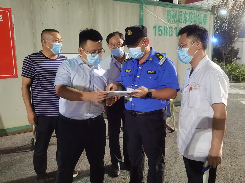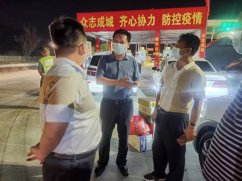 一面鲜红的党旗在夜色中猎猎作响,已近深夜,在X301兴泰大道东首卡口,执勤人员们还坚守在岗位上。李伯群等与值守人员进行了深入交流,详细了解进出卡口车辆人员检查情况,他要求值守人员对苏康码、行程码信息、测量体温等一个都不能少,一点都不能马虎。