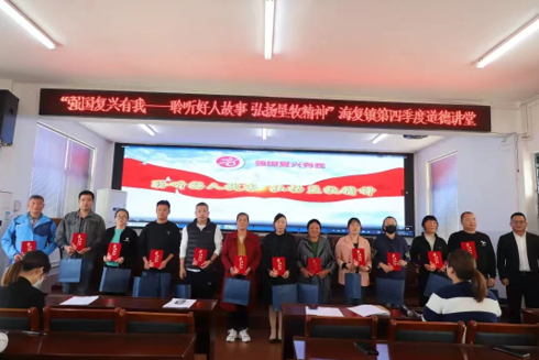 表彰结束后,海复镇创文专员宋凯博向在座人员发放《移风易俗倡议书》,旨在让“好人”在移风易俗、反对歪风陋习上起带头作用,发挥好榜样的力量,讲好“文明故事”,培育文明新风尚。