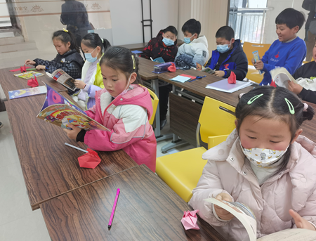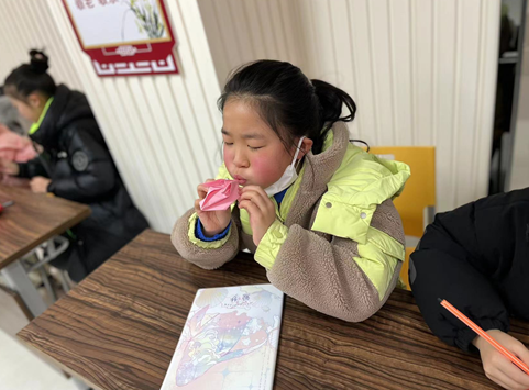每个小朋友都分到了一张彩色纸,这是今天的第二个项目---巧手折纸。在折纸过程中,孩子们认真聆听每一个步骤,在工作人员的帮助下,渐渐掌握了技巧,小手一翻一折,用力一吹,一只活灵活现的“兔子”就出现了。大朋友帮助小朋友,不一会儿的功夫,每个小朋友手中都有一只圆鼓鼓胖嘟嘟的纸兔子。小小手工,传递着一份节日的祝福,更承载着一份厚重的传统文化。