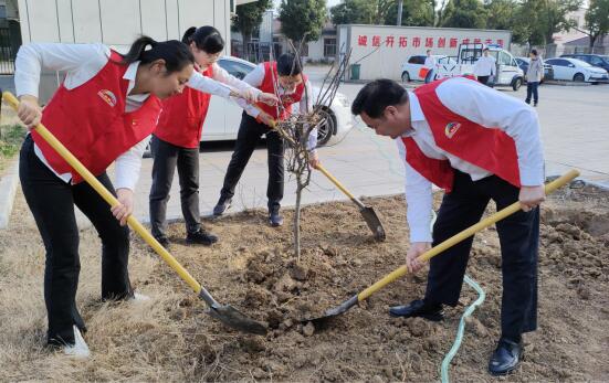 9点30分,活动正式开始。党员代表有序分工合作种植海棠树苗,个个热情洋溢、干劲十足。挥锹铲土、挖坑扶苗、填土浇水,植树现场呈现出一幅春日忙种图。