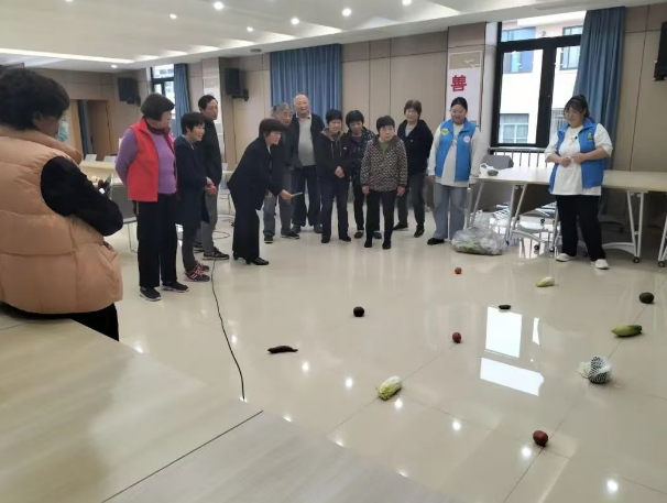 在“击鼓传花”游戏中,幸福二村社区居民围坐在一起。伴随着鼓点,花球在居民的手中快速传递。当音乐停止时,大家纷纷拿出“看家本领”,有的演唱经典歌曲,有的说了一段故事,现场气氛热烈,居民脸上洋溢着喜悦的笑容。在“公鸡赛跑”比赛中,用纸板将气球从起点运输至终点,用时最短的获胜。居民个个眼明手快,快速地将气球运送到指定位置。一旁观赛的同伴不时发出加油声和喝彩声,整个活动室里欢呼声、欢笑声交织在一起,居民乐在其中。在“蔬菜套圈”中,居民手持套圈,站在指定的位置,瞄准目标投掷。有的居民手法精准,不一会儿就收获颇丰,手中的袋子装满了各类蔬菜,可谓满载而归。