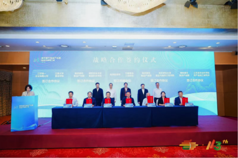 “宁工品推”展区特别设置了南京都市食品产业园专区,多维度呈现品牌魅力与产业特色。在同期举办的2025南京都市食品产业园投资环境推介会上,南京市工信局与高淳区人民政府主要负责同志为“携手共建南京都市食品产业园”揭牌。