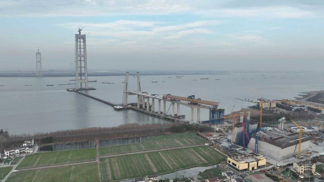 立春时节,张靖皋长江大桥南航道桥的施工现场一片繁忙。