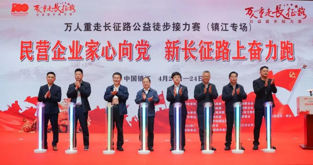 4月23日,省委统战部、省工商联和市委统战部、市工商联牵头在句容茅山启动民营经济领域“万人重走长征路公益徒步接力赛”(镇江专场)。启动仪式上,企徒文旅集团向茅山管委会李塔村捐赠壹佰万圆作为乡村振兴助农基金。4月24日上午全国各地工商界代表近300人,组成的28个徒步团队,齐聚苏南抗战胜利纪念碑广。奏唱国歌、敬献花篮,他们在巍峨的苏南抗战胜利纪念碑下重温入党誓词,表达对先烈的敬仰与哀思之情。随着发令枪响起,所有队伍正式出发,接力赛全程为13.8公里。参赛者从苏南抗战胜利纪念碑出发,途经句容福道、农业园区、新四军医疗所、新四军修械所遗址、新四军水坝,最终抵达红色乡村-陈庄。