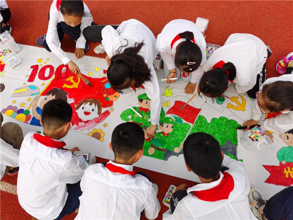 句容市图书馆与华阳实验小学弘景校区联合开展了“童心向党 献礼百年”长卷绘画活动,孩子们通力合作完成的巨幅党史画作,一笔一画深情地表达了句容青少年对党的感恩之情和对祖国的美好祝愿。