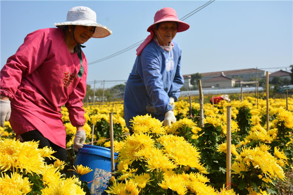走进花田,放眼望去,一朵朵金灿灿的金丝皇菊开满田间。趁着晴好天气,农户们正在忙着采摘金丝皇菊,田间一派繁忙景象。种植基地负责人石磊告诉记者,今年种的这30亩金丝皇菊眼下刚进入盛花期,盛开的场景吸引了附近的游客前来打卡、拍照。虽然之前遭遇高温干旱天气,但通过加强田间管理,及时梳理花枝,目前菊花长势依旧喜人,一天能采收1000公斤鲜花,收益还是比较可观的。“今年是我们种植的第四年,一亩地的收益能够达到3万元左右。”负责人石磊开心的说。