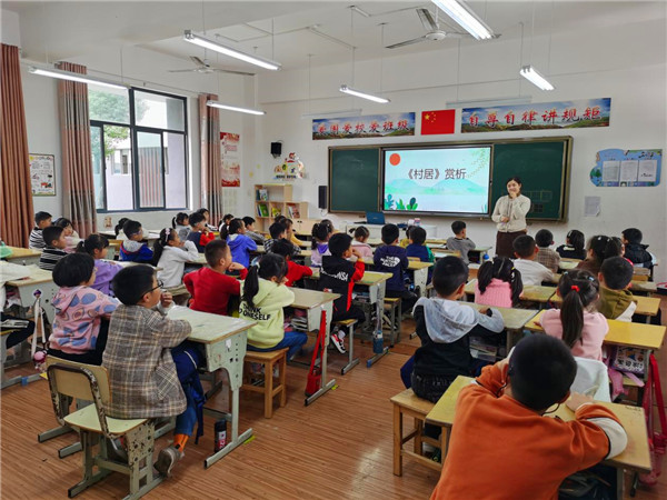 活动中,图书馆老师以《村居》《望庐山瀑布》为例,用游戏的方式,从发音、断句、情感等方面为孩子们进行了生动有趣的诵读讲解;以情景化的体验与孩子们频频互动,将其带入诗歌的意境中。还结合诗歌内容逐句分析朗诵技巧,示范朗读方法,并让学生集体进行了现场朗读。