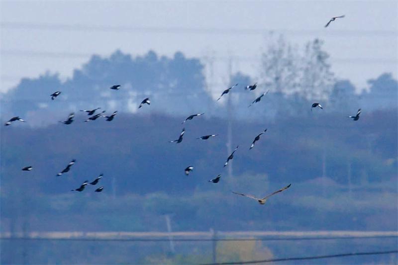 此前不久,摄影爱好者还在赤山湖湿地拍到红隼、白腹鹞与白尾鹞等多种猛禽。专家称,每年秋冬季节,数万只雁鸭类候鸟迁入赤山湖国家湿地公园越冬, 们也成为猛禽的主要猎食目标。不少猛禽甚至会尾随它们迁徙。“由于栖息环境类似,这些猛禽时常与喜鹊、八哥等当地的优势留鸟发生“领地之争”。反映了赤山湖湿地的生物多样性越来越丰富,发展势头良好。”监测保护部负责人告诉记者。